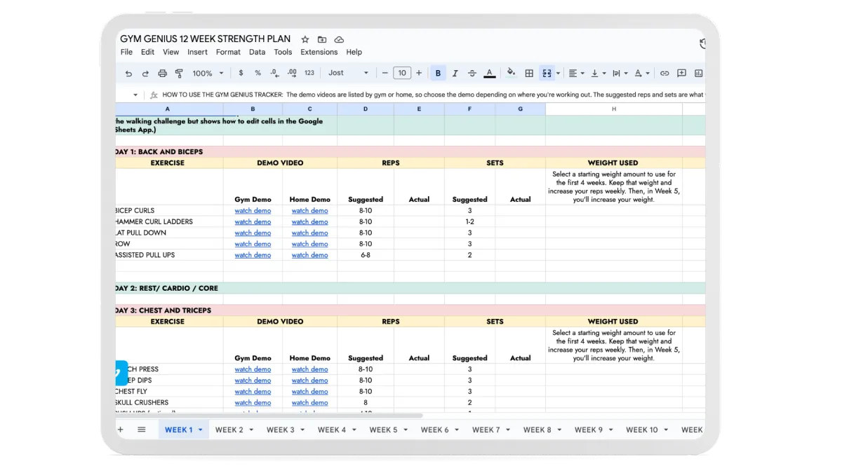 Our tracker is super awesome! We give you a 12 week google spread sheet that you can use from your computer or phone. You'll track what exercise you did, how much weight you used, how many reps you did. Week by week you'll record your gains and your progress so you can see how well you're progressing!