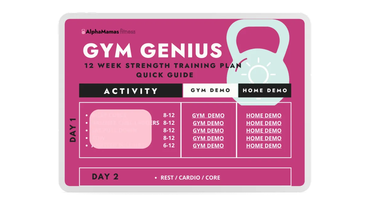 Check with your healthcare provider before beginning this or any exercise program. The Gym Genius program and all AlphaMamas programs are based on the professional education and personal experience of Suzanne Edwards and Jennifer Penney, and are intended for women in generally good health. Not every program or exercise is right for every person, so you MUST consult with your healthcare provider before doing any exercises in the program. This is not a substitute for any kind of medical/professional advice. You exercise at your own risk and take full responsibility for how your body responds to these or any exercises. You agree to hold Suzanne Edwards and AlphaMamas Fitness, LLC, and Jennifer Penney and ABC Stronger completely harmless and not liable for any and all injuries that might occur as a result of your movements.
